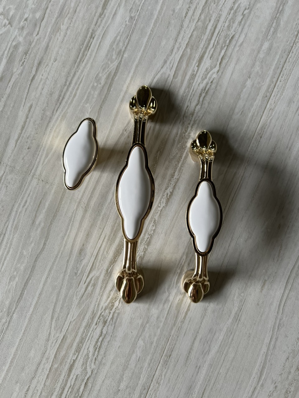 Tay nắm cổ điển bằng sứ TN1150-96, Phù hợp lắp đặt cho cửa gỗ tủ bếp, tủ trang trí mang phong cách cổ điển, tân cổ điển, chất liệu được kết hợp bởi hợp kim kẽm mạ vàng đồng sáng bóng và sứ được mài dũa tỉ mĩ theo thiết kế độc đáo.